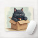 A fluffy black cat with a red collar and golden bell is comfortably nestled inside an open cardboard box