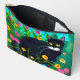 Pouch in an image of a sleek black cat with striking yellow eyes sitting amidst vibrant, colourful flowers in shades of pink, yellow, red, and blue. The lush green foliage and bright, saturated background give the scene a lively, whimsical feel.