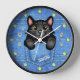 This fun novelty clock includes a faux (printed) denim / blue jean look and includes a cartoon black kitty cat that appears as if it's sitting inside a pocket! The design also includes "patches" (printed) that resemble the silhouettes of paw prints. Time is kept with printed "buttons." Use the easy template to add your name or your cat's name to the design (or simply delete the sample name "Tabitha" to order without a name). These cute clocks make the perfect gift for any cat owner! They would also be fun for an animal groomer or vet.
