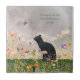 A calm black cat sits in a patch of pretty flowers and watches a colourful butterfly flit through the air. The words “Sometimes it’s the little things that bring joy to your day” can be removed or changed if desired.