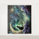 This enchanting celestial design features a black cat perched gracefully on an ornate golden crescent moon, surrounded by shimmering stars and cosmic clouds. Deep shades of teal, indigo, and violet create a dreamy night atmosphere, while golden details add a touch of magic and elegance. The scene blends mystery and serenity, evoking a sense of wonder under the starlit sky.
