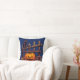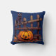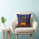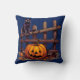 This Halloween-themed throw pillow captures the essence of a whimsical autumn evening. Against a dark blue background, a cute black cat is depicted perched on a wooden fence, adding a charming and playful touch to your decor. In front of the fence, a jack-o'-lantern and scattered orange autumn leaves complete the scene, evoking a sense of seasonal warmth and Halloween magic.