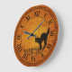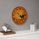 A graphic design for the Halloween season of a black cat standing on a crooked fence with an orange chenille background. The clock face has black Roman Numeral numbers.