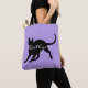 Silhouette of a short hair black cat viewed from the side with his ears up and head turned to the front. The tail is curled up in a playful posture. Your name or choice of text displays over the centre in a pretty white script. Shown on a lavender background colour option. Artwork and design by Karlajkitty