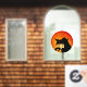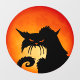 Scary black cat with orange eyes in front of a big, full, orange moon.