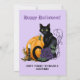 A black cat, purple rose, pumpkin and candle halloween party invite