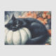 Watercolor Autumn Black Cat Decoupage Craft Tissue Paper featuring a sleepy black cat, white pumpkin, and orange leaves.