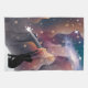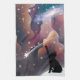 This outer space illustration seems a bit surreal with clouds in blue, pink, purple and yellow. A black cat sits on the moon gazing out at the stars with fascination as she reaches out to grab one in this funny feline cartoon that is sure to be appreciated by any black cat lover.