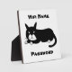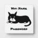 Cute black cat with text displaying a reminder of your wifi network name and password.