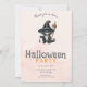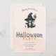 At the centre of the invitation is a cute black cat, adding a playful and whimsical touch to the design. The cat is depicted holding a witches broom and wearing a striped witches hat, adding to the festive and spooky theme of the invitation.