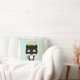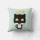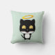 A pillow with a cute black and white angel kitty cat with a golden halo above her head, drawn in cartoon style. Pastel green background.