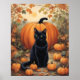 The image features a black cat sitting in front of a large pumpkin. The cat has striking green eyes and contrasts with the orange pumpkin. Surrounding the cat and the large pumpkin are several smaller pumpkins. The background is adorned with autumn leaves in shades of orange, yellow, and red for the fall season. The overall atmosphere of the image is warm and seasonal, with a focus on the classic symbols associated with autumn and Halloween.
