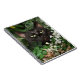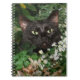 Black cat looks out from the daisy like wildflowers he's snuggled in with photo notebook