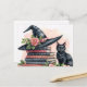 This postcard features a black cat next to a book stack with a with hat on top. This feminine aesthetic artwork is perfect for Halloween or anyone who loves black cats, academia, and witchy themes. The pink roses add a soft, delicate touch for pink-o-ween or bubblegum goth aesthetics.
