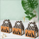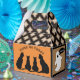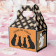 Traditional meets Gothic with this Halloween themed Favour Box. The four side panels have a traditional flair starting with the front and back. There's an orange background with the silhouette of four black cats. The text, which reads, TRICK OR TREAT, can be customised. On the two side panels there is a ghost on a brown background. The top half of the box has a dark brown and beige, diamond pattern with a gothic touch.