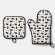 This adorable oven mitt and pot holder set for cat lovers features a pattern of black cats in different poses with paw prints on a white background.