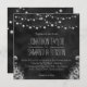 String of Lights Chalkboard © Sunny Mars Designs. Stylish, modern, elegant, classy, trendy, chic customisable formal or cute casual 5.25" x 5.25" wedding invitations with a beautiful black chalkboard design featuring bulbs of rope or string lights hanging above with a floral tropical design below.