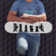 Black chess pieces on white skateboard
