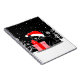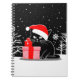 Christmas design features a black cat adorned with a red Santa hat and sitting next to a red and white wrapped Christmas gift, on a black-and-white winter wonderland background of trees and snow.