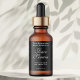 This cosmetics dropper bottle product label features a black background with white text. This label measures 2.375 inches long by 1.25 inches high (60 mm long by 32 mm in height) and is a great choice when you are looking to package essential oils, fragrance oils, face serums, hair serums, and other products in standard 1 ounce or 2 ounce glass dropper bottles.