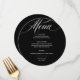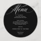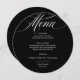 This elegant, dark black wedding round menu card features classic, old-world style with romantic white calligraphy. Add your dinner choices for starters or appetizers, first course, main course or entrée, and desserts. Set the tone for your luxe, sophisticated Italy inspired wedding reception or rehearsal dinner, or bridal shower food offerings, with this classy, minimalist design.