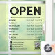 Practical and modern opening hours business decal in black for your store windows or store door with opening hours per day, your phone number, social media and website next to white icons, and a QR code your customers and clients can scan for easy access to your online presence. All text is customisable.