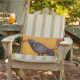 This outdoor pillow for your home decor has a black crow standing on a tree branch with Art Deco style abstract Red roses on stems with green leaves and yellow centres on each side of the crow on a golden yellow background.