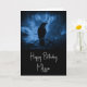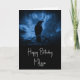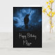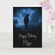 Birthday card with an image of a black raven at night perched on a tree branch with runes above which says "black raven".
