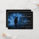 A wedding invitation with an image of a black raven at night perched on a tree branch with runes above which says "black raven". Moody and mysterious vibe.