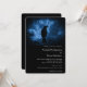 A wedding invitation with an image of a black raven at night perched on a tree branch with runes above which says "black raven". Moody and mysterious vibe.