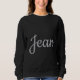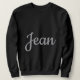 This is a custom name Jean black sweatshirt for women. The sweatshirt shown is a black colour. The name Jean in script is on the front of the sweatshirt in a silver colour. The name on the front of the sweatshirt can changed by typing in a new name. You can change the name to another name by clicking the Personalise button. Then you can type in a new name.
