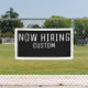 Custom white on black now hiring banner with a white border.