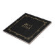 Black floral vintage damask pattern background with a gold tones Art Deco frame and gold custom text.