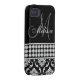 This monogrammed black and white damask iPhone 4 Case-Mate Case has a photo of this design embedded into the hard plastic cover. The design is made up of a black and white damask pattern, a print of three rows of white diamonds in a stripe and an area where you can add your name and monogram initial in gorgeous script fonts. This iPhone 4 case cover is the perfect way to accessorise your iPhone 4. Be stylish and girly all at the same time. Design by Elke Clarke©2012. Graphics licensed for use. You can "customise it" and chnge the background colour and font.