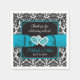 These personalised and romantic wedding napkins are perfect to use at your wedding reception, bridal shower, or rehearsal dinner. These black and white damask pattern wedding napkins are sure to be a memorable hit with your guests and are another way to keep a cohesive look throughout your wedding celebrations. The square design area of these wedding napkins has a turquoise ribbon and bow image with joined hearts images across the centre. There are turquoise flourishes in all four corners. Above the ribbon, the words, "Thank you for celebrating with us!" are printed in white script on a black background. Below the ribbon, the names of the happy couple and the wedding date are printed in turquoise blue and white, also on a black background. There is a second version with a white background if you prefer. If you need any other matching items, please email niteowlstudio@gmail.com and watch your spam/junk folders for my reply, or use the Zazzle chat feature to contact me.