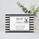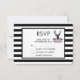 Wedding or other event RSVP card with a black deer head with large antlers. Geometric lines inside the face of the deer adds a creative touch. Colourful pink flowers and mint green leaves form a pretty floral bouquet below his head. A mountain range sketch placed amongst the flowers also adds to the rustic country feel. Background is a black and white striped pattern.
