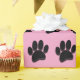 Cartoon dog pawprint in black with light pink background. Faux 3D effect applied to the image.