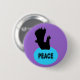This badge features a black silhouette of a fancy dove with a white eye, sitting on a blue oval shaped nest with the word peace written in black in the centre of the nest. The background is purple but can be changed to any colour you like by clicking on the “customise it” button.