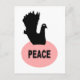 This postcard features a black silhouette of a fancy dove with a white eye, sitting on a pink oval shaped nest with the word peace written in black in the centre of the nest. The background is white but can be changed to any colour you like by clicking on the “customise it” button.