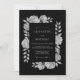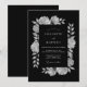 This design features a striking monochrome aesthetic with delicate white roses and botanical foliage set against a deep black background. The high-contrast palette creates a sophisticated mood ideal for formal evening events. Graceful leaves and soft petals provide a romantic touch to the dramatic, dark backdrop.