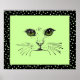 This art poster is light green with a black illustration of a cat face with long whiskers and intense green eyes. It has a black border with bright green polka dots.