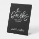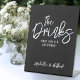 This custom sign features a simple black and white design with a clean black background and crisp white fonts for a timeless look. “The Drinks Are On Us” is displayed in a mix of elegant handwritten script and classic serif fonts, with “Cheers” adding a fun finishing touch. It’s a stylish way to let guests know it’s an open bar.