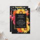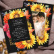 Set the stage for an elegant event with this autumn wedding invitation. A lush and luxurious floral wedding invitation featuring a frame of sunflowers, red mums, lantanas, black-eyed susans, autumn leaves, and blue berries against a black background. It is perfect for a dramatic and unforgettable celebration. The back features a place for your photo. Ideal for those who appreciate timeless allure. PLEASE NOTE: The gold featured in this design is NOT REAL foil.
