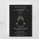 This elegant engagement party invitation features modern calligraphy script, a rich black background, two champagne glasses, and a gold heart. To personalise, simply click on "personalise this design."