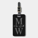 Create Your Own Stylish Modern Custom World Traveller Black Vertical Monogram Name Luggage Tag. This sleek and modern luggage tag adds a personalised touch to any travel adventure, perfect for anyone who loves to explore with style. The front features a dark grey two-letter serif monogram using the first and last initials, stacked vertically with your full name in white handwritten script centred between them. The black background gives it a bold yet elegant look that works well for both men and women.