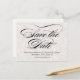 This is an elegant wedding save the date postcard featuring black script text design and white pearl background