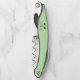 This corkscrew is light green with a black etching of the face of a cat with whiskers and green yellow eyes on a light green background.