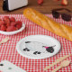 A black faced sheep with lots of white wool and a flower in its hair. This design looks really effective on these Paper Plates