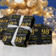 This wrapping paper design features a message like "HAPPY 98th BIRTHDAY", with the "98th" having a faux/imitation gold appearance. It also features a personalised name, and a black coloured background. It could perhaps be used when wrapping gifts being given for somebody’s ninety eighth birthday. [~Z0000130]