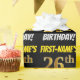 This wrapping paper design features a message like "FIRST-NAME’S 26th BIRTHDAY!", with the "26th" having a faux/imitation gold-like colour appearance, and with the name and "BIRTHDAY" in a fun, bold font. The name can be personalised, and the background is coloured black. Wrapping paper like this could perhaps be used when wrapping birthday gifts being given to somebody in celebration of their twenty sixth birthday. [~Z0000203]